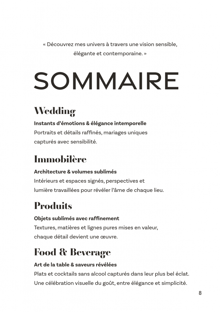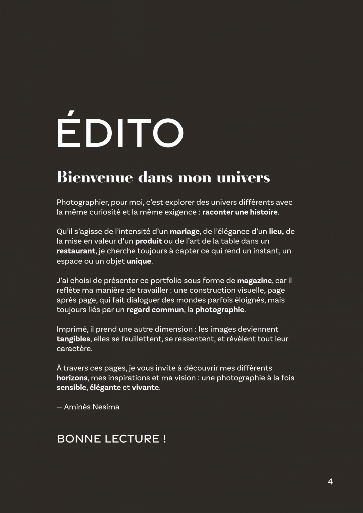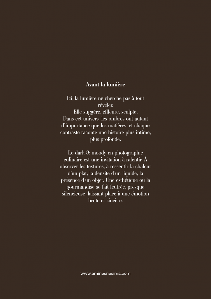L’éditorial est au cœur de ma démarche : compositions intentionnelles, univers marqués, esthétique soignée et cohérente. Ce format me permet de dévoiler mes travaux — produits, food, beverage, hospitality, mariages et projets créatifs — avec la même exigence qu’une publication artistique ou mode.